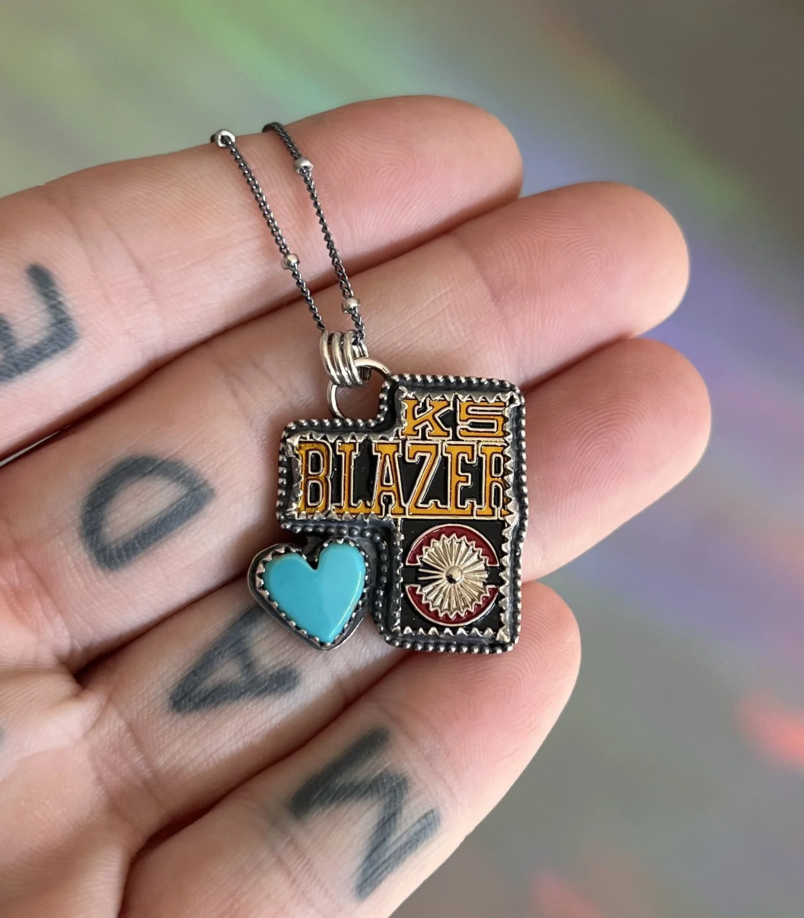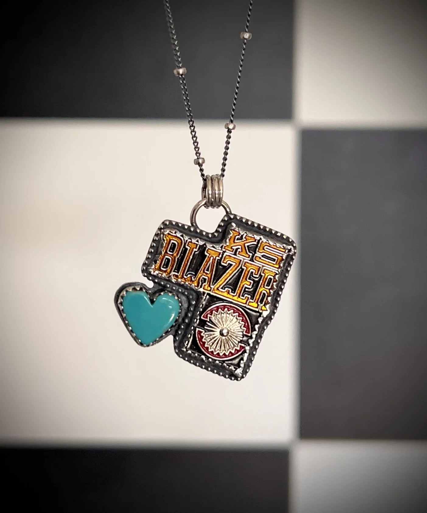 Hand crafted with sterling silver, an upcycled hat pin and a fix Turquoise heart. This banger includes an 18” sterling silver chain