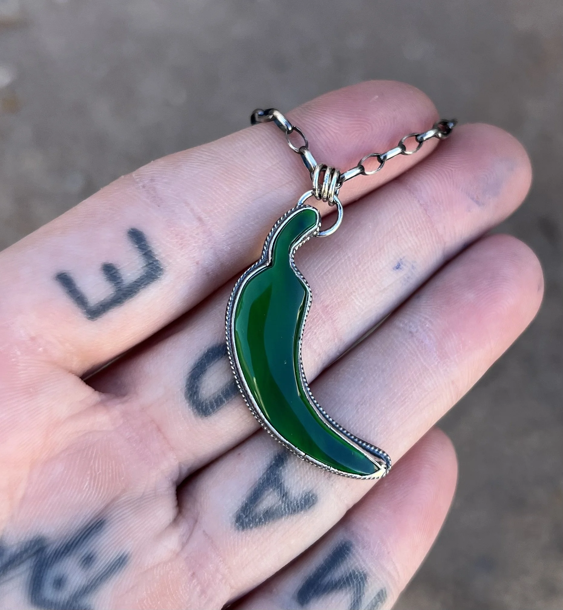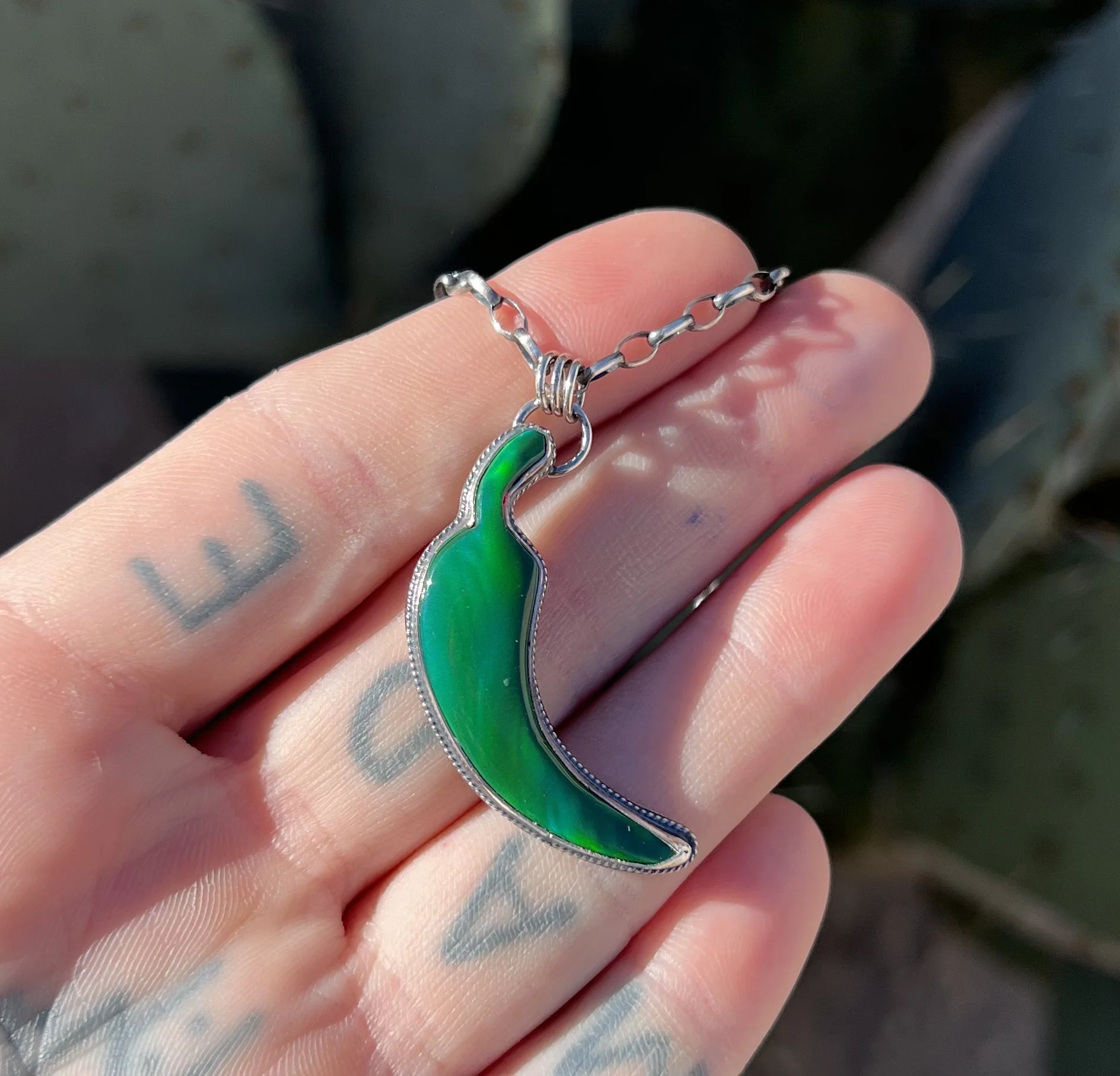 Hand crafted with sterling silver and aurora opal (lab crated opal). This banger includes an 18” sterling silver chain but can be worn at shorter lengths.