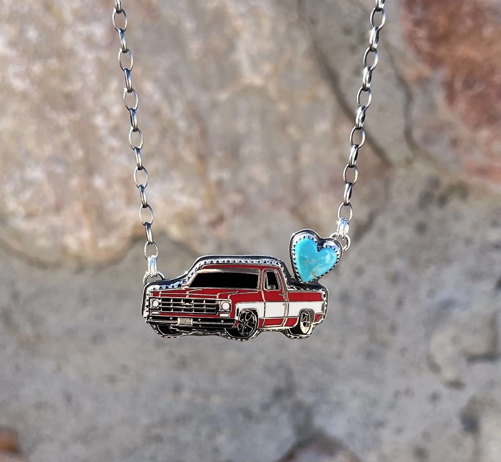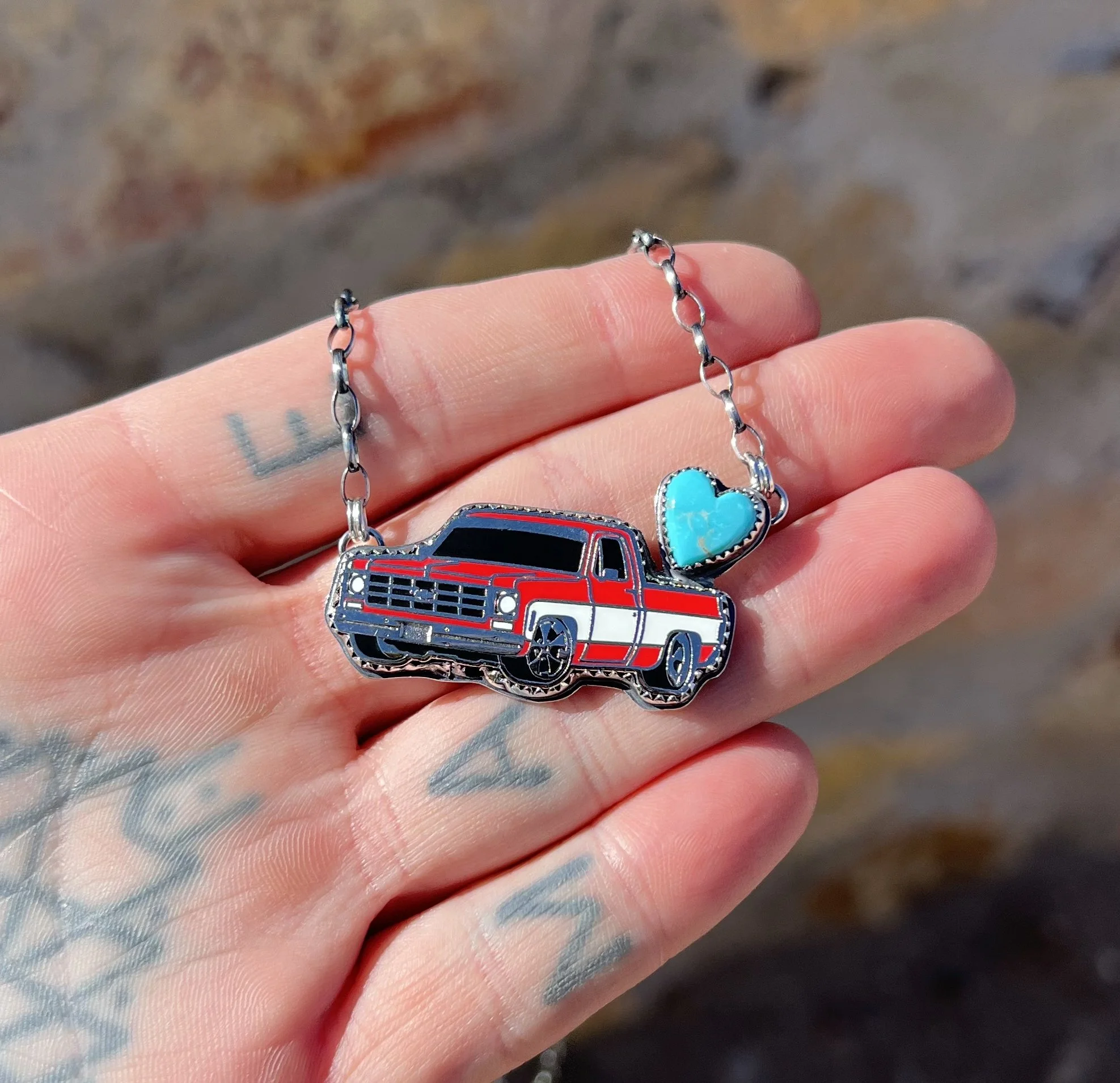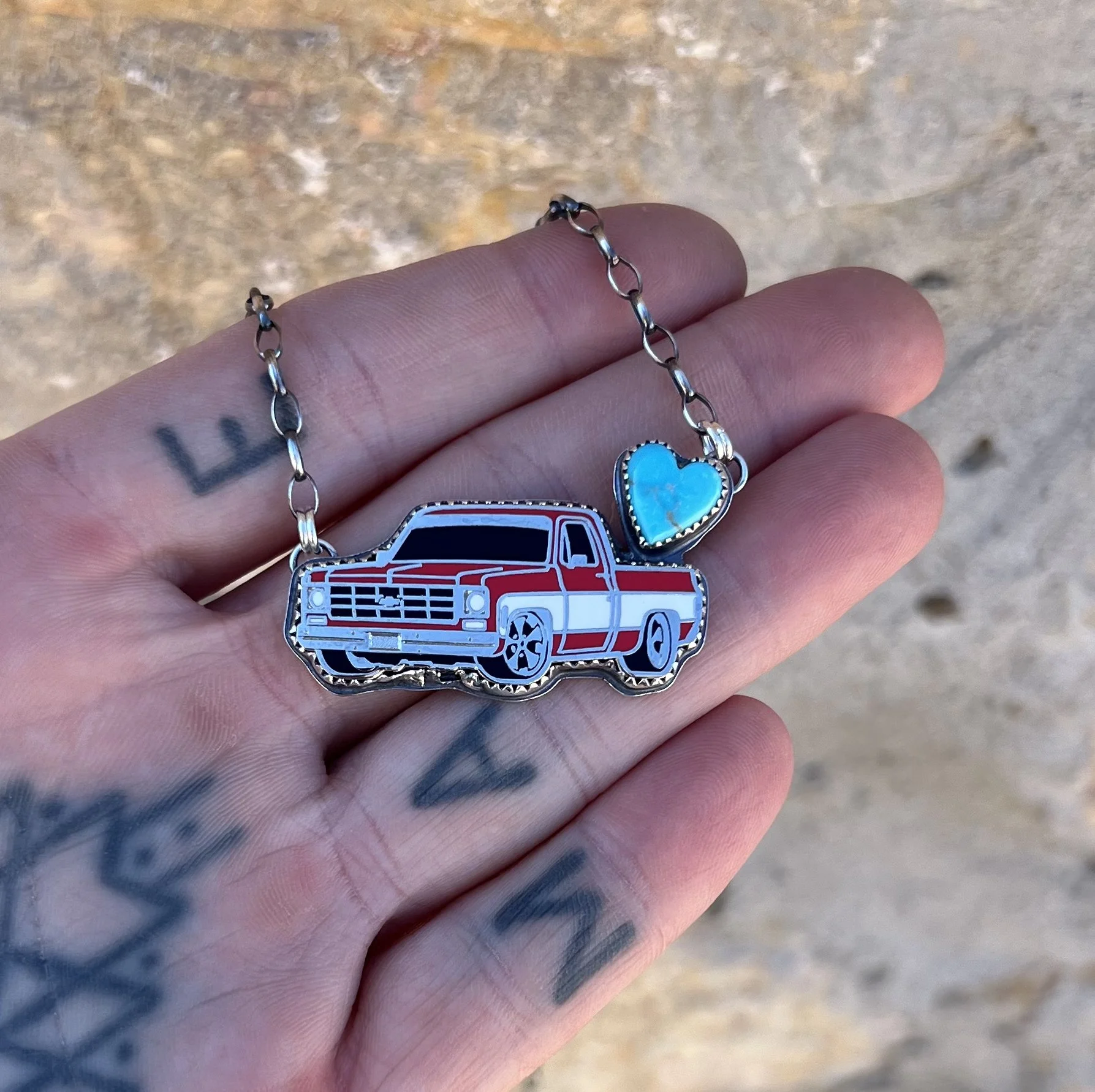 Hand crafted with sterling silver, an upcycled hat pin and a fox Turquoise heart. This banger is fixed on an 18” sterling silver chain but can be worn at shorter lengths.