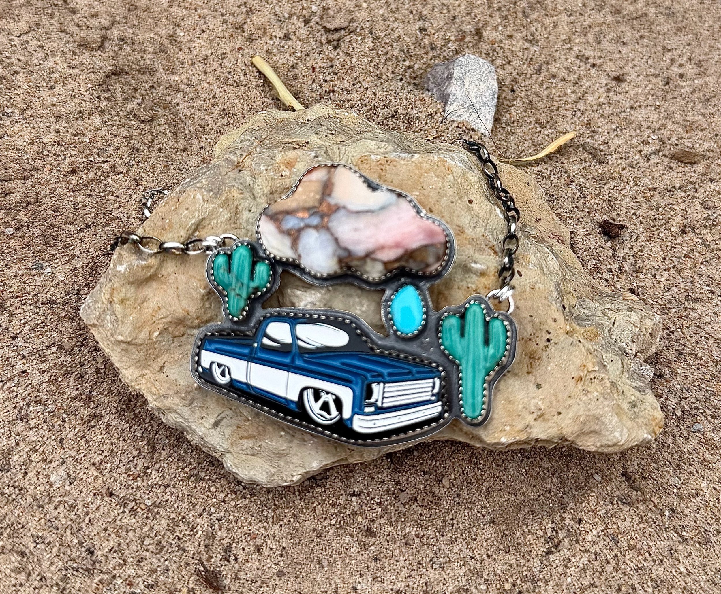 Hand crafted with sterling silver, fine silver, an upcycled hat pin, pink Mojave (man-made material) and Mina Maria Turquoise. This banger is fixed on an 18” sterling silver chain but can be worn at shorter lengths.