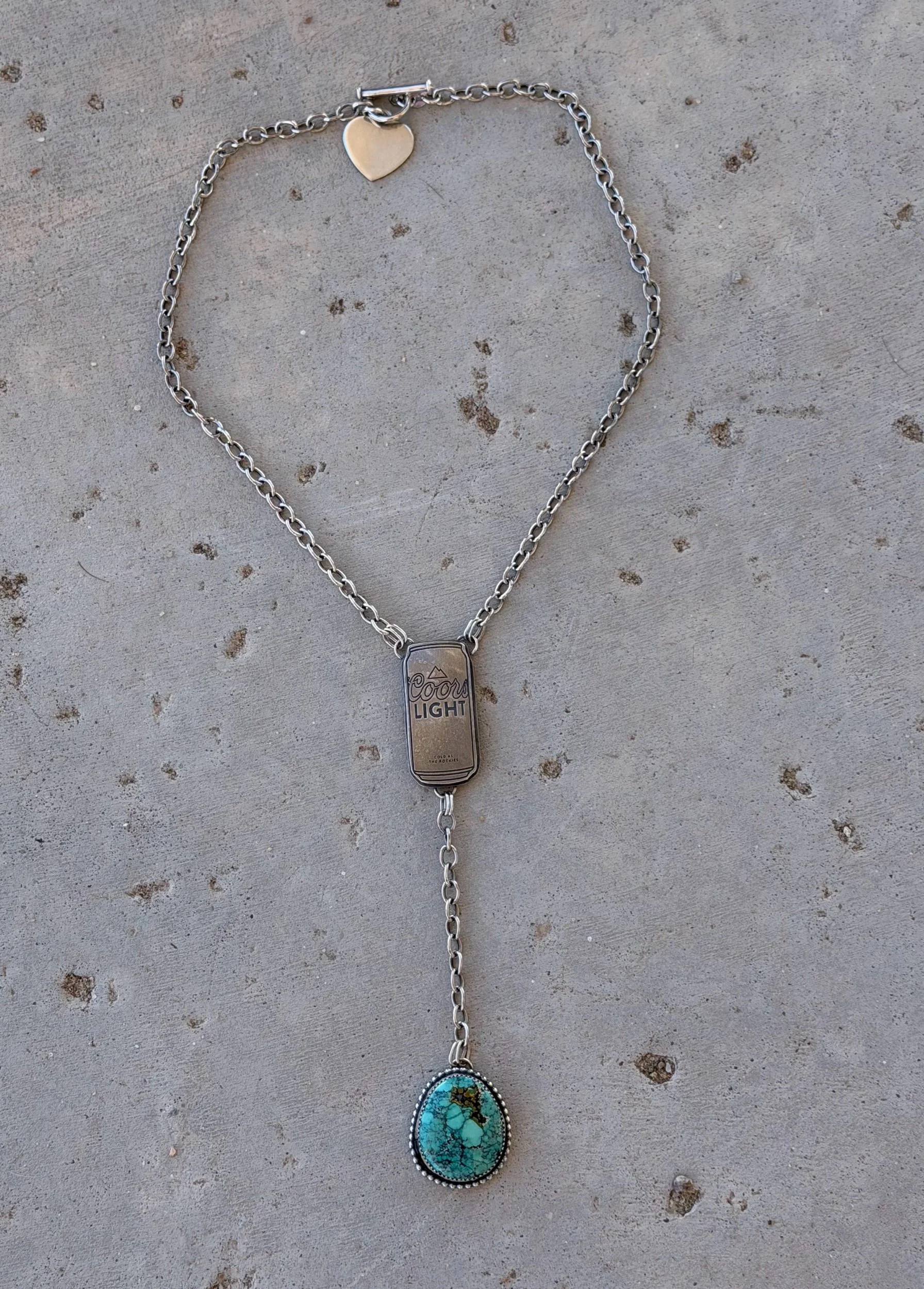Hand crafted with .925 sterling silver, .999 fine silver and High Grade Hubei cut by Wild Ride Silver. The can sits at 16” in length with a 2” drop of sterling silver chain in addition the to the length of the stone. Beer can is laser engraved on a 18g piece of silver.